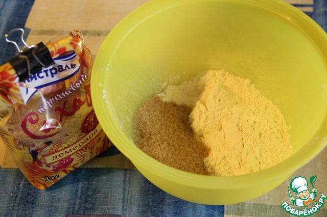 Духовку разогреть до 180С, подготовить форму D18 см. В миске смешать муку, разрыхлитель и сахар, добавить масло и воду.