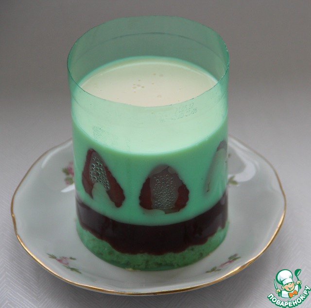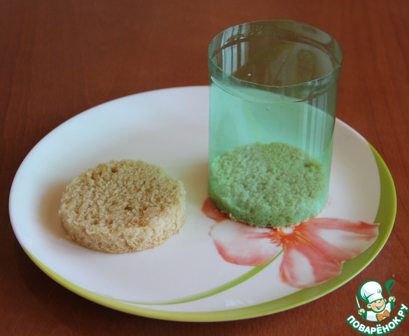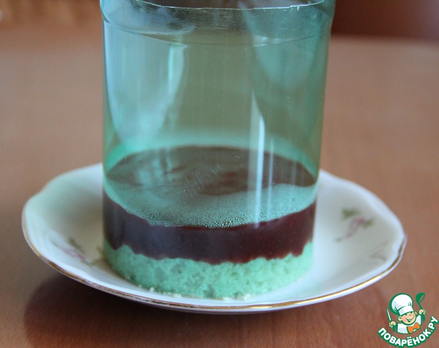 Далее нам понадобится сервировочное кольцо, причем достаточно высокое. У меня не нашлось подходящего, поэтому я отрезала ровную часть от пластиковой бутылки. С его помощью вырезаем из бисквита круг, это будет основа десерта.