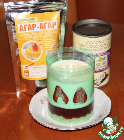 Готовим кокосовую прослойку. Кокосовое молоко перелить в кастрюльку, добить сахар и нагревать на среднем огне. Как только молоко начинает закипать, добавить агар-агар, хорошо размешать, чтоб не осталось комочков (можно помочь себе блендером), и проварить 1-2 минуты. Остудить. 5-6 ягодок клубники разрезать пополам, одну оставить целой (для украшения десерта).