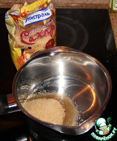 Готовим карамель. Сахар пересыпать в кастрюльку, залить водой, добавить уксус и варить до светло-желтого цвета. Затем снять с огня и опустить донышко кастрюли в холодную воду, чтобы остановить процесс варки. Немного остудить карамель и перемешать ложкой. Нарисовать узоры карамелью на силиконовом коврике или пекарской бумаге.