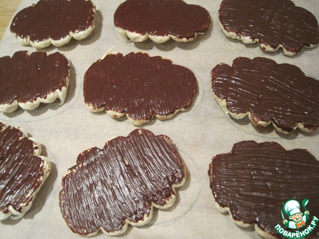 Шоколад растопим на пару. Кисточкой нанесём тонкий слой шоколада на плоскую (нижнюю) часть овалов..