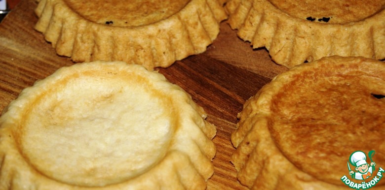 Раскатать тесто и поместить в формочки для тарталеток, проколоть вилкой. Выпекать в прогретой до 180 градусов С духовке 8-10 мин. до золотистого цвета. Остудить и освободить от формочек.