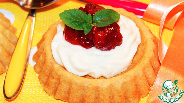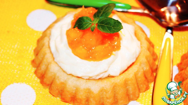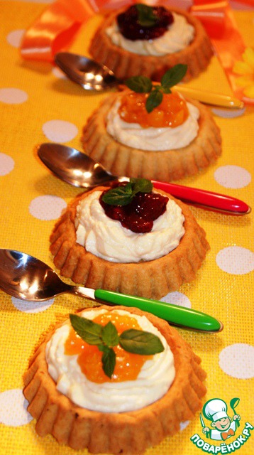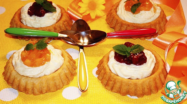 Заполнить тарталетки кремом, сверху поместить немного конфитюра, у меня мангово-абрикосовый и клубничный по рецепту http://www.povarenok .ru/recipes/show/663 04/