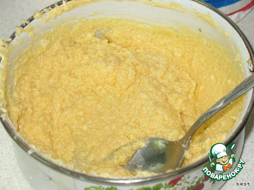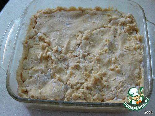 Одну часть выложить в смазаную форму и руками распределить. Должны получиться высокие бортики.