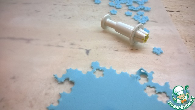 Из мастики разных цветов, при помощи плунжера вырезаем цветочки.