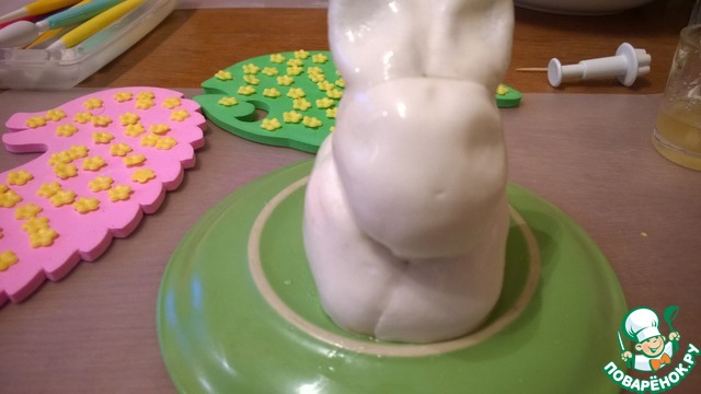 Обтягиваем зайчика, белой мастикой и разравниваем по силуэту. Лишнее отрезаем. Делаем зайчику глазки из черной мастики и носик из белой мастики