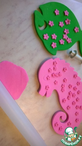 Подготавливаем мастику, белого, голубого и розового цветов.