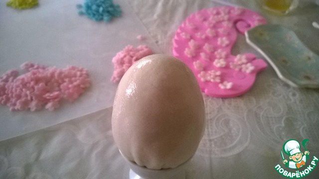 Обтягиваем яйца белой мастикой, как на фото. Лишнее обрезаем ножницами. Разглаживаем руками, чтобы не было складок.