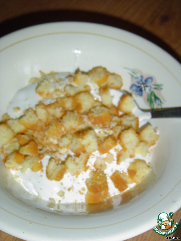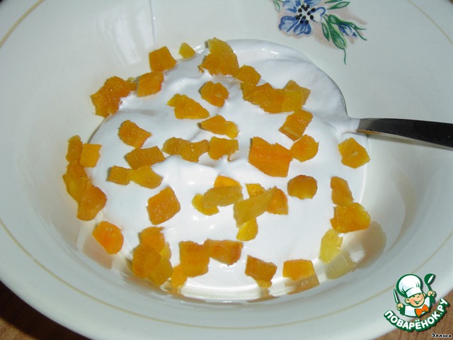 Для приготовления крема взбиваем охлажденные белки с сахаром, добавляем к ним творожный сыр, осторожно перемешиваем. Маленькими кубиками нарезаем курагу, добавляем ее к крему, перемешиваем.