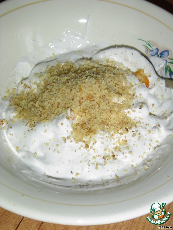 Так же нарезаем бисквит, измельчаем орехи и добавляем к крему.