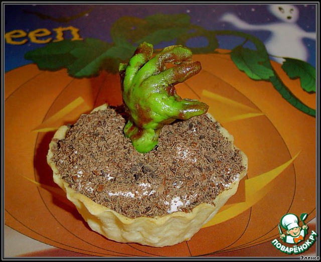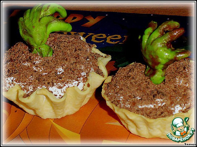 Эти симпатичные ручки вставляем в центр тарталеток. И что получаем, в итоге, а вот что - "руки мертвецов рвутся на свободу":-D :-D :-D :-D :-D Ну, что? Страшно?