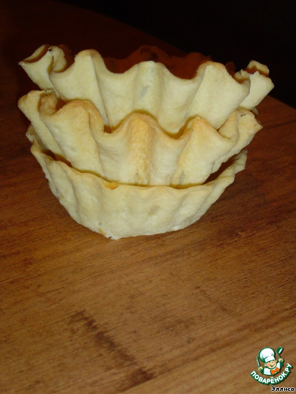 Готовое слоеное тесто раскатываем, стаканом вырезаем кружочки, распределяем их в смазанные маслом формочки и выпекаем при температуре 180 гр. до золотистого цвета.