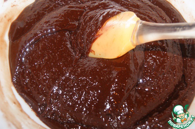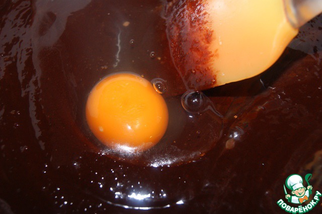 Ввести в шоколадную смесь по одному яйца, хорошо каждый раз их вмешивая.