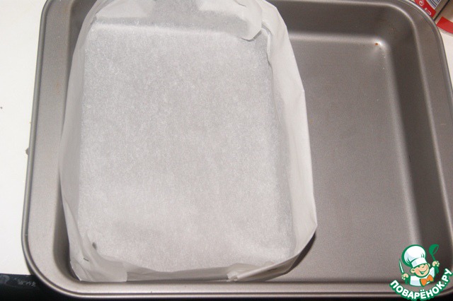 Для выпекания нам понадобится противень размером 12х15 см застеленный пекарской бумагой. У меня такого нет, но я смастерила его сама из пекарской бумаги, скрепив бока степлером.