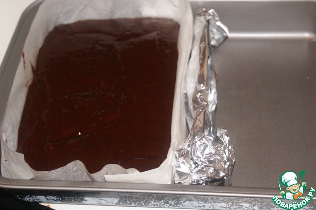 Поместить тесто в форму (сбоку (справа) я сделала перегородку, обернув столовую ложку фольгой, чтобы бумага не расползалась под тяжестью теста).