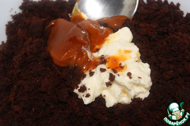 Руками раскрошить остатки брауниз в крошку, добавить к ним 1 ст. л. оставшегося крема, я добавила ещё 1 ст. л. крема карамель (всё, что осталось от приготовления ёлочек безжалостно поглотил мой дорогой муж!)
