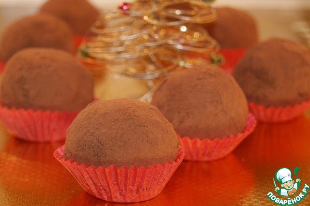 Поставить на 20 мин. в холодильник и... можно обвалять в орехах, можно в кокосовой стружке, в белом шоколаде и. т. д. Я обваляла в какао. Ох, и вкусные получились конфетки! Скажу вам по секрету, что вишню я замариновала на 10 минут в 1 ст. л. коньяка.