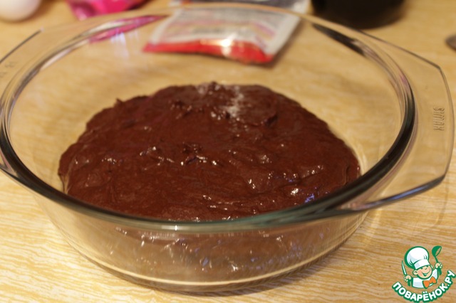 Вторая часть: смешиваем 1 яйцо, 0,5 ч. л. разрыхлителя, 3 ст. л. сахара (без горки), 4 ст. л. муки, 3 ст. л. молока, 2 ст. л. гранатового соуса, 3 ст. л. растительного масла. Выпекаем. Примечание: вместо гранатового соуса можно взять любой сироп. Пробовала в пиале смешать сметану 20% жирности со свежей малиной, но тогда вместо молока 2 ст. л. теплой воды добавляла.