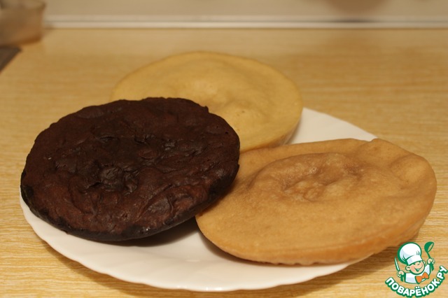Вот такие "плюшечки" получились. Для торта я их разрезаю на два-три слоя, формирую необходимую форму торта, выкладывая последовательно слои разных цветов, промазывая их кремом.