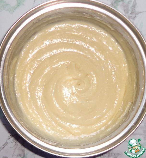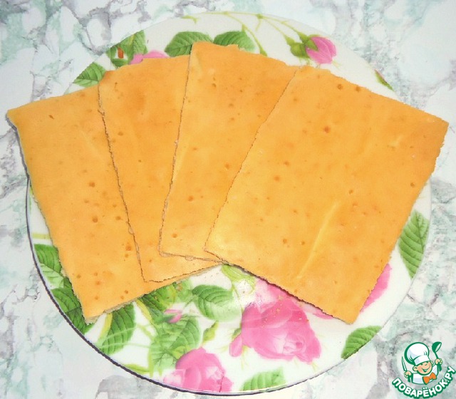 Выпечь корж при температуре 180-200 градусов 10-15 минут и разрезать на 3 или на 4 равные части.