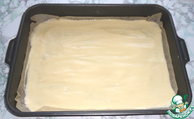 Форму для запекания или противень застелить пергаментной бумагой, вылить тесто и разровнять по всей площади.