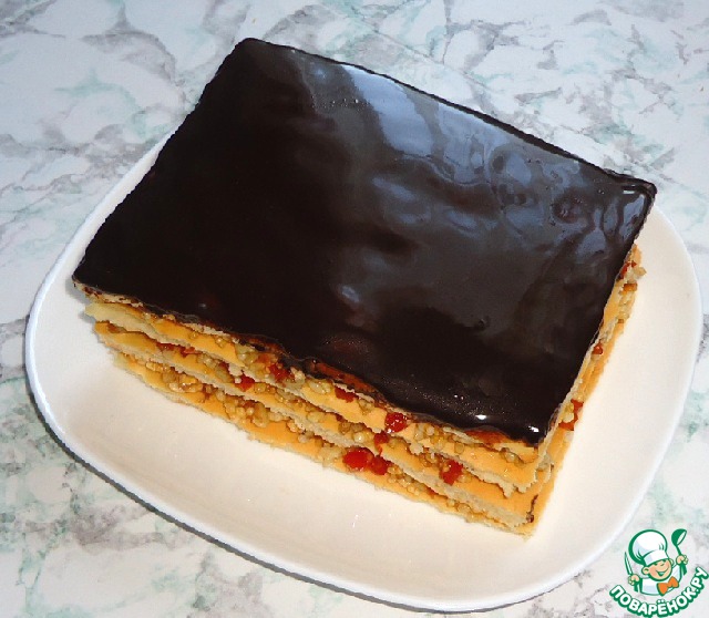 Приготовить шоколадную глазурь: какао, сливочное масло, сахар, молоко поставить на медленный огонь, постоянно помешивая, довести до кипения и кипятить 1-2 минуты. Глазурь немного остудить и полить сверху последний корж.