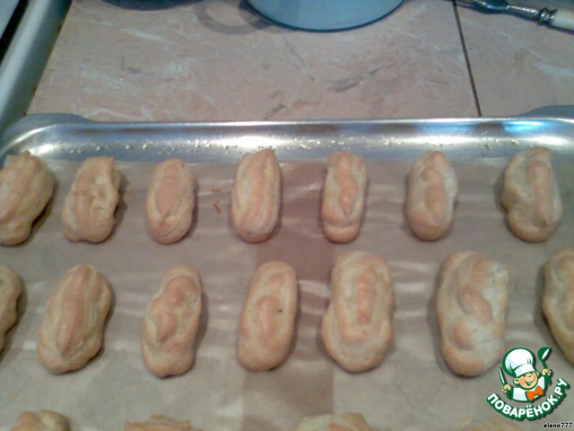 Выпекать в разогретой духовке при температуре 180 градусов 35-40 минут. Дверцу духовки не открывать, пока пирожные пекутся. Готовые эклеры остудить.