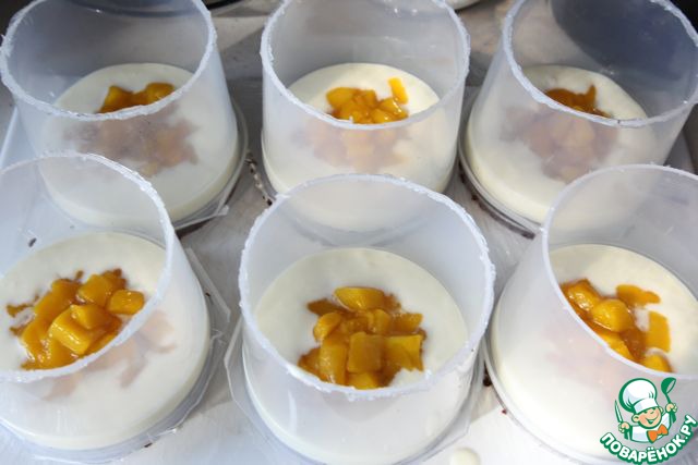 Разделите мусс на две части. Распределите первую часть в формы для пирожных, в которых уже находится бисквит. Ровно в центр, не касаясь стенок, выложите сцеженные от жидкости кубики манго.