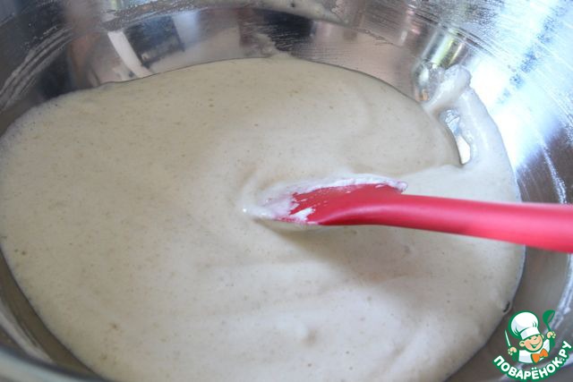 Яйца разделить на две части, добавить первую часть и начать взбивать, смесь вначале очень густая, получается больше перетирать, чем взбивать. Далее добавить вторую часть яиц и на сильной мощности взбивать массу под наклоном, добавляя в тесто пузырьки воздуха. Тесто облегчается и увеличится вдвое в объеме.