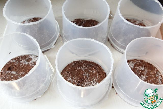 Возьмите формы, которые вы будете использовать. У меня самодельные формы из пластиковых баночек для сыпучих продуктов, не пугайтесь их вида, других здесь не нашла, но прекрасно с этими справляюсь :) Я готовила половину порции, у меня вышло 6 штук диаметром 7 см. Выдавите ими основу наших пирожных и установите на застеленную пленкой поверхность.