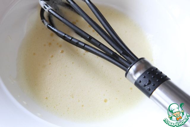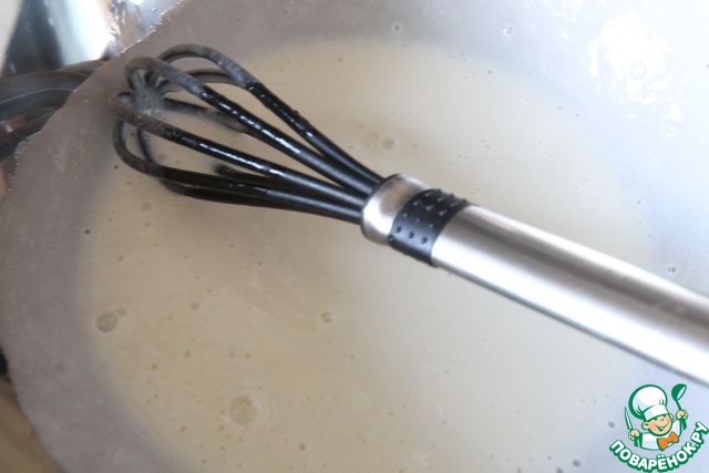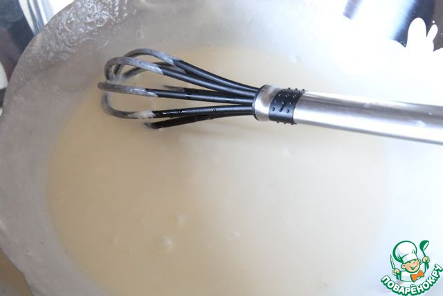 При постоянном взбивании добавляем частями растопленное сливочное масло, хорошо перемешивая.