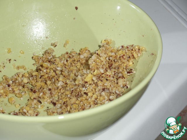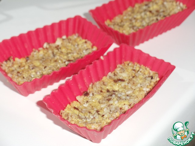 Силиконовые формочки наполовину наполнить ореховой смесью, ложкой утрамбовать. Убрать в холод.