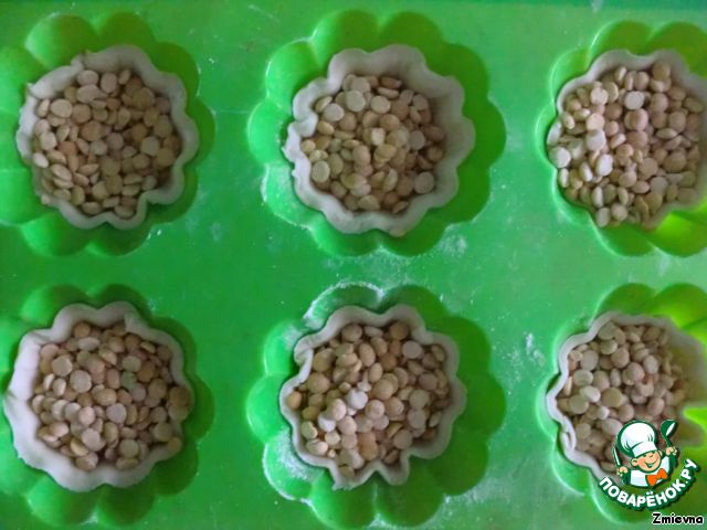 Кружки теста выложить в формочки и насыпать почти до краев горох, чтобы тесто не поднималось и сохранило нужную форму.