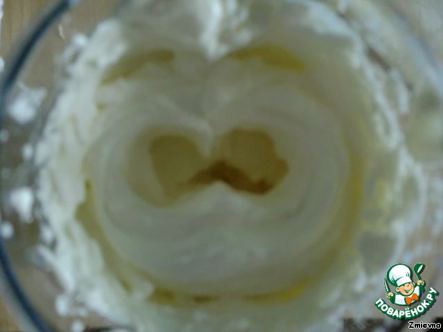 Приготовить крем. Взбить сливки с сахаром и сыром до пиков.
