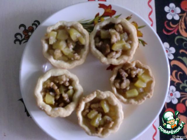В корзиночки выложить начинку. Для начинки на разогретую сковороду выложить масло и сахар, добавить довольно крупно нарезанные орехи, слегка обжарить их в получившейся карамели и добавить нарезанные кубиками персики, перемешать. Как только персики покроются карамелью, выключить огонь. Начинка готова (у меня не совсем получился нужный эффект,так как персики были консервированные, но все равно было очень вкусно)