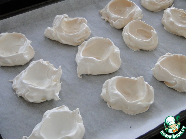 Смочите ложку водой и сделайте углубление в каждой меренге.
