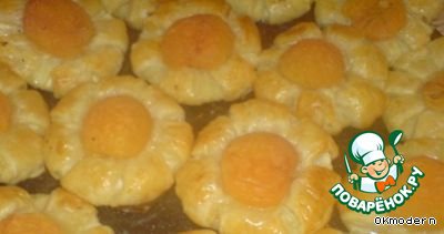Серединку закрываем половинкой абрикоса, укладываем "ромашки" на противень, смоченный водой,