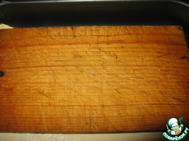 Накрыть пекарской бумагой, сверху поставить ещё форму, чтобы тесто при выпечке не поднималось. Я положила разделочную деревянную доску.