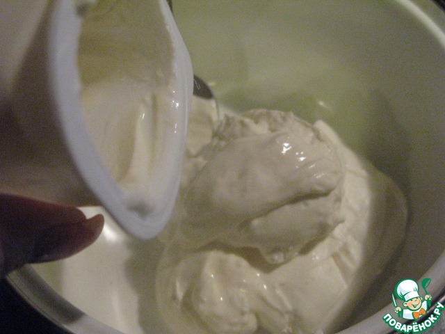 Творог взбить с йогуртом, добавить коньяк, ещё раз взбить.