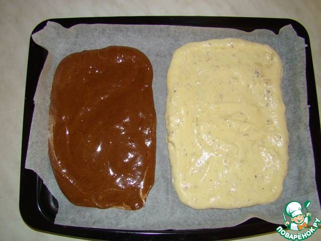 Выкладываем обе массы на пекарскую бумагу и отправляем в разогретую до 180 градусов духовку на 10-12 минут. Проверяем готовность деревянной лучиной.