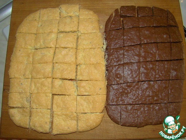 Готовые бисквиты режем на квадратики и полностью остужаем.