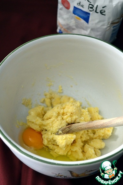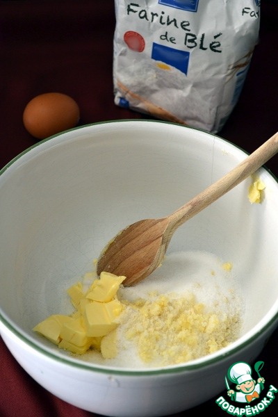 Итак, приготовим тесто. Для этого мягкое масло смешать с сахаром и молотым миндалем.