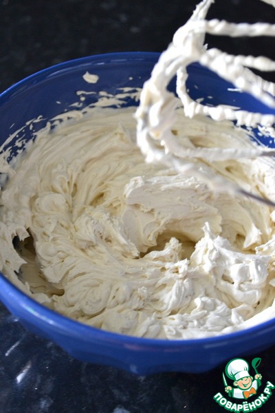 Заключительный этап: достать из холодильника крем и взбить его (сначала на средней скорости, затем увеличить). Крем взбивается быстро, минуты за 3.