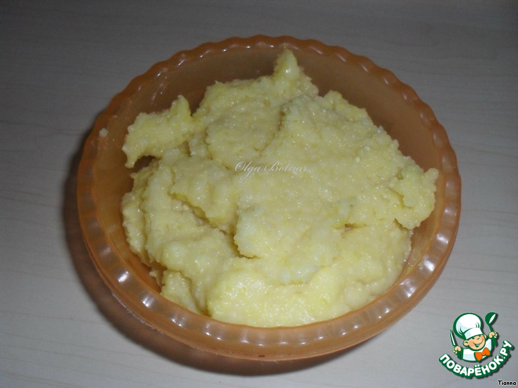 Кашу измельчить в блендере (чтобы не было крупинок). Добавить туда желтки и сахар, смешанный с ванилином и взбить миксером.