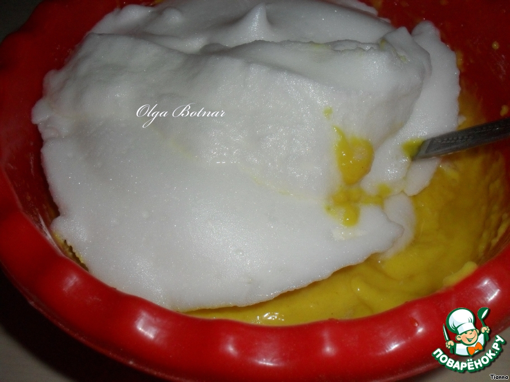 Затем переложить в тесто взбитые белки и аккуратно размешать. Не стоит добиваться полного «растворения» белков, хватит нескольких перемешивающих движений.