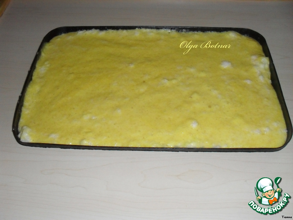 Готовое тесто вылить на смазанный противень, разровнять и поставить в разогретую до 160 градусов духовку. Выпекать 30-40 минут.