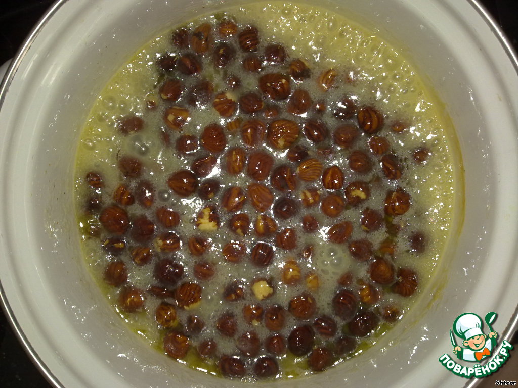 Чернослив вымыть и порезать на 4-6 частей (в зависимости от размера). Добавить его в помадку, туда же всыпать фундук. После закипания массы, варить её до загустения 5-7 минут