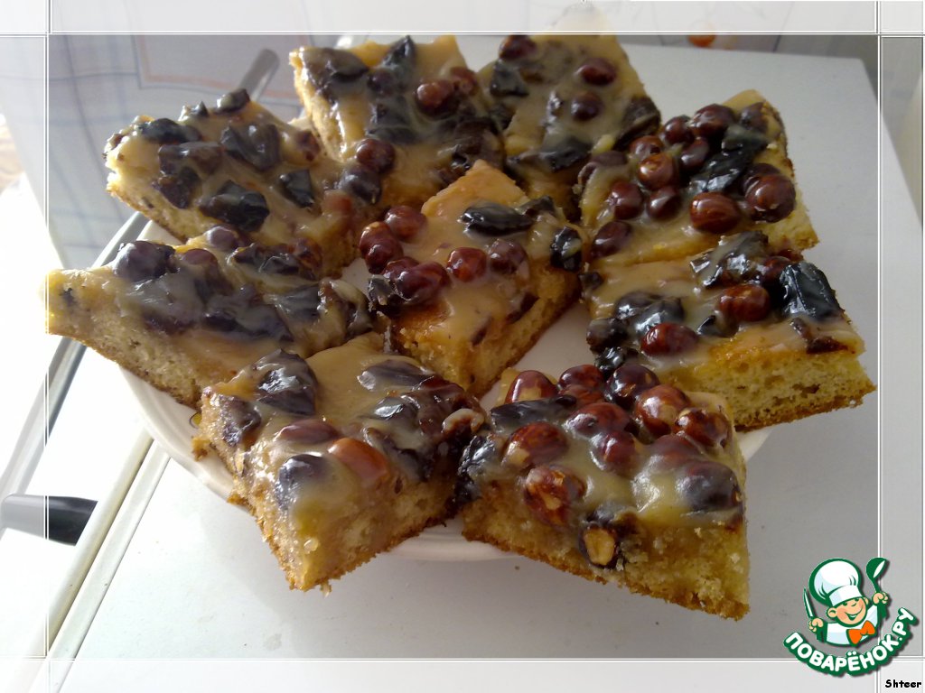 Извлечь корж из противня и произвольно нарезать (у меня они в форме ромбиков, но кто захочет - может и повыпендриваться)
