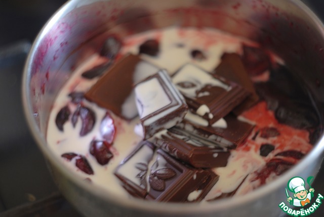 Снимаем вишню с огня и добавляем прямо в горячую кусочки шоколада и сливки.
