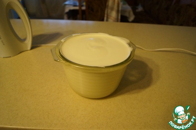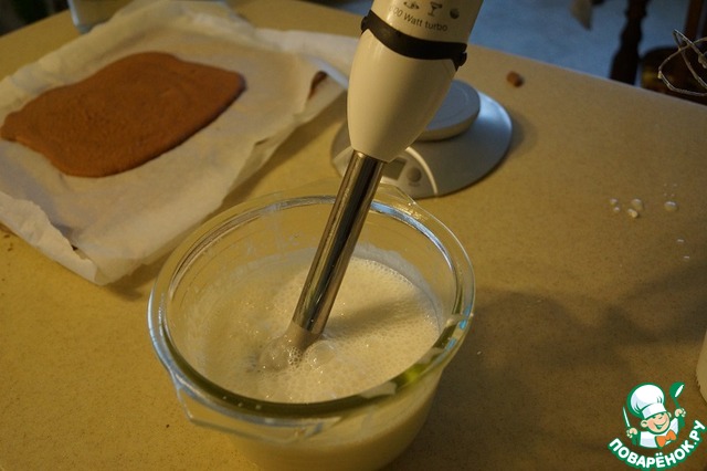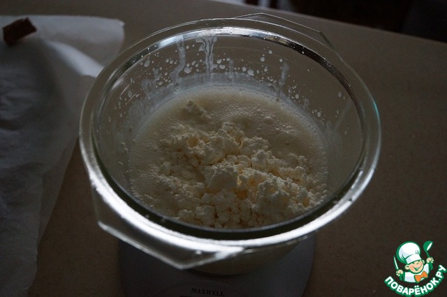 Заранее замоченный желатин ставим на водяную баню и, помешивая, даем ему раствориться. В полученную творожную массу медленной струйкой вливаем остывший желатин, взбивая миксером.